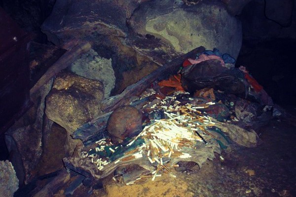 Bermodalkan lampu petromax yang disewakan, kami pun memasuki Goa Batu di Londa ini. Jujur aja bulu di tangan saya langsung berdiri gara-gara merinding lihat tulang belulang dan peti-peti di depan saya. Dan sepertinya “sesajen” yang paling umum di bawa adalah rokok! Mungkin karena di alam sana tidak ada penjual rokok, atau masa lalu orang yang dimakamkan disini adalah perokok berat, entah lah… Yang pasti mereka adalah perokok selera tinggi, terlihat beberapa merk batang rokok yang berkelas premium loh